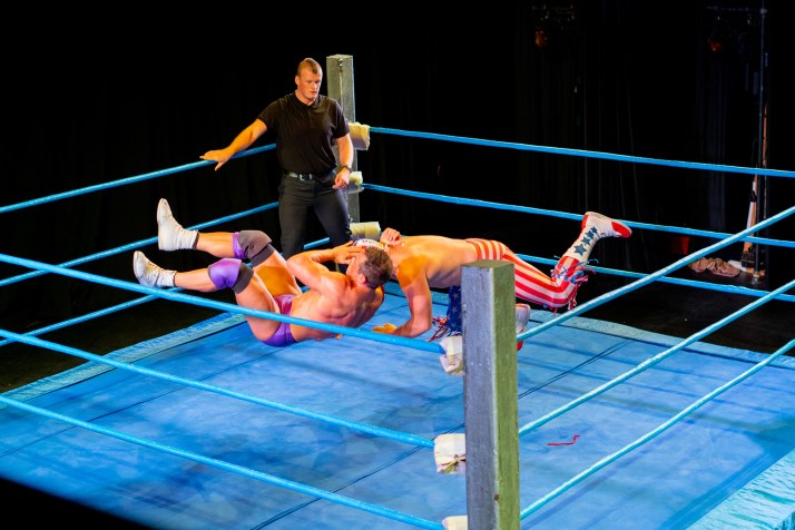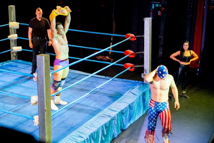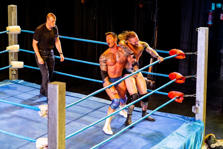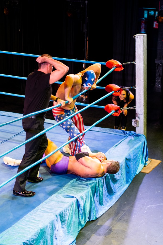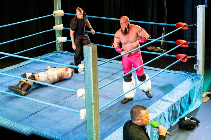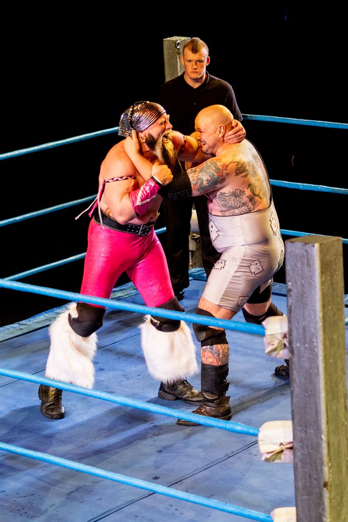 Bout 4 was more a carefully choreographed dance than a fight, that was until a ‘low blow’ brought a messy end to it at which point a variety of previous wrestlers appeared in the ring to add to the tension. After a number of accusations had been thrown around with the aid of a microphone, the announcer carefully stepped in, asked the crowd if a rematch was in order and then checked what date in February next year people would prefer..