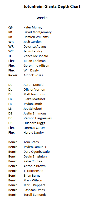 Anyway, that was Week 1 and the Jotunheim Giants have a 0-1 all-time record. Poo.